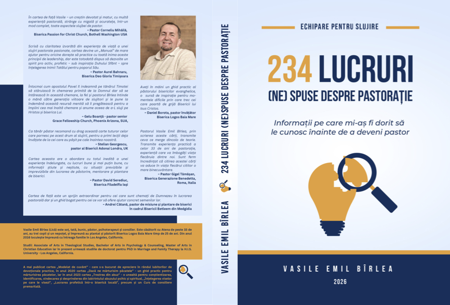 „234 lucruri (ne)spuse despre pastorație” este un ghid practic și sincer despre realitățile slujirii pastorale. Cartea adună reflecții născute din experiența pastorală și oferă principii, avertismente și încurajări pentru cei care slujesc sau se pregătesc pentru lucrare. Pe lângă observații și perspective biblice, cititorul găsește în paginile ei întrebări de reflecție, teste de evaluare personală și instrumente practice menite să ajute la clarificarea chemării, la dezvoltarea caracterului și la maturizarea slujirii. Cu un ton direct și pastoral, autorul deschide o conversație necesară despre responsabilitatea, provocările și frumusețea chemării de a păstori oameni.